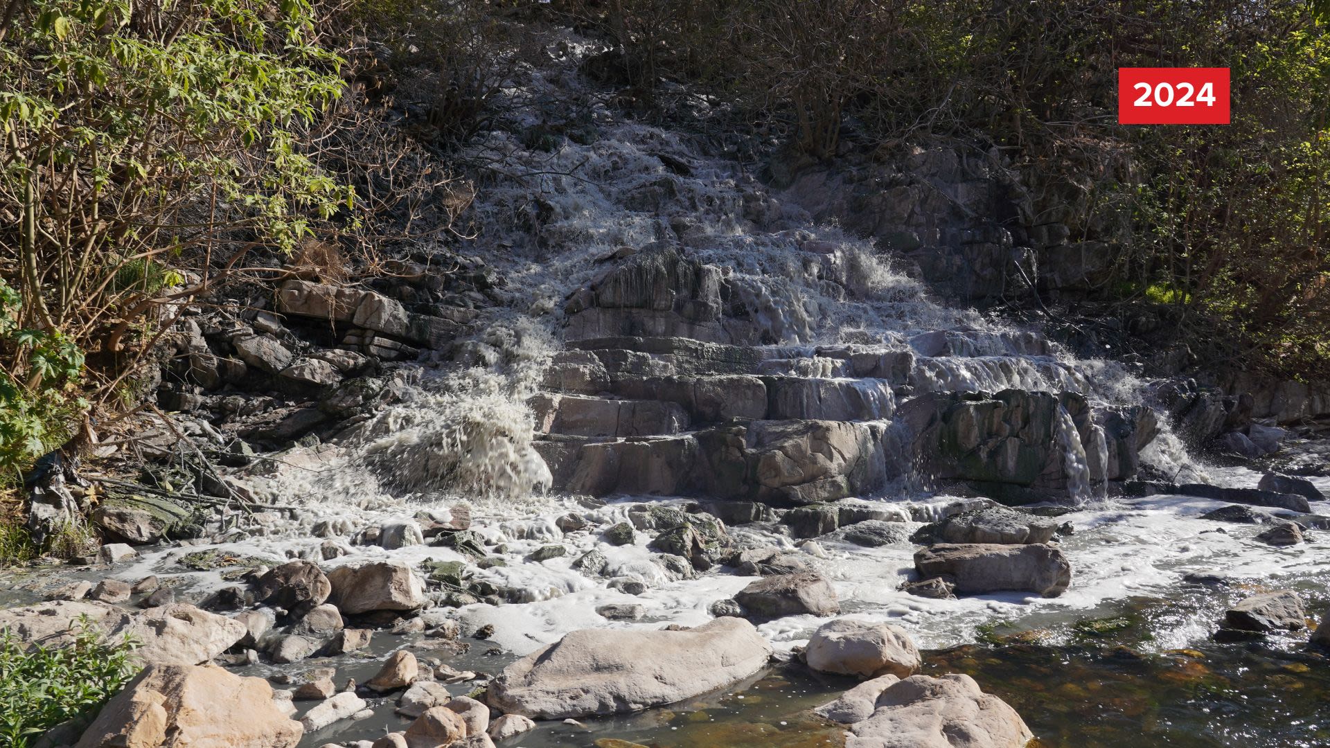 The water released into the river has changed from the oily black, foul-smelling sludge to greyish, lighter water free of poop.